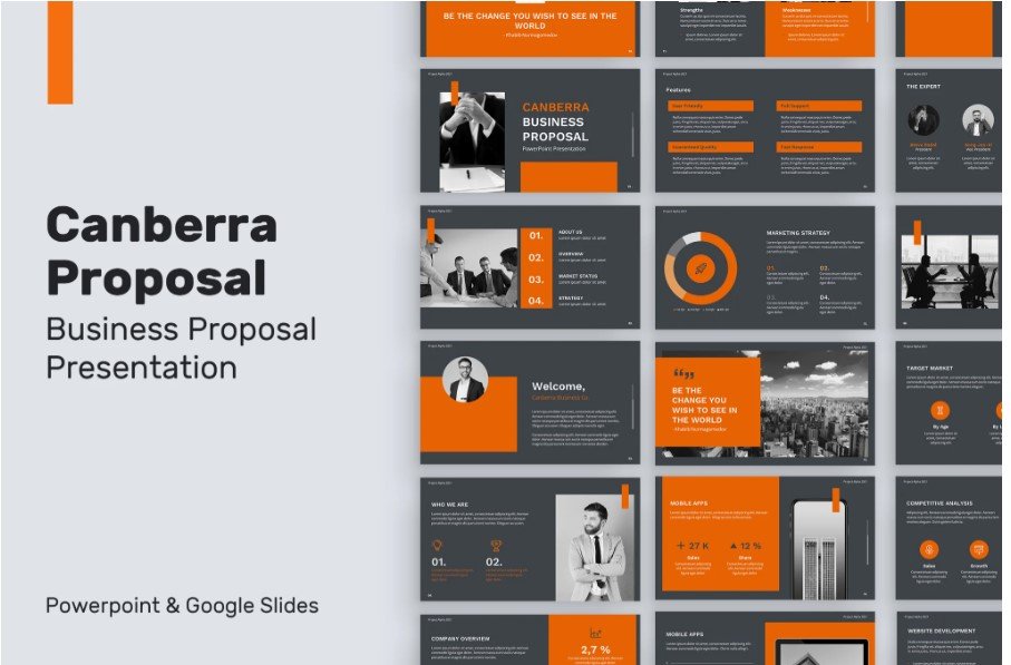 Take your business proposal to the next level with the Canberra Business Proposal Presentation Template. Designed with a modern dark gray and bold orange color scheme, this template is perfect for creating a compelling pitch that stands out. This free PowerPoint (PPT) and Google Slides template ensures a professional, sleek, and engaging presentation.