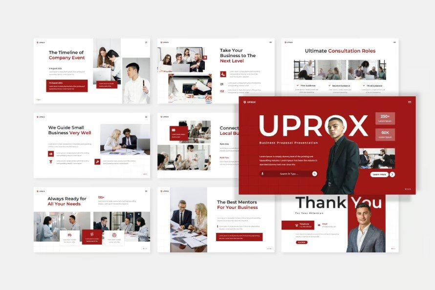 Create a powerful and professional business proposal with the UPROX Business Proposal Presentation Template. This free PowerPoint (PPT) and Google Slides template features a modern red and white color scheme, making your presentation bold, clean, and engaging.