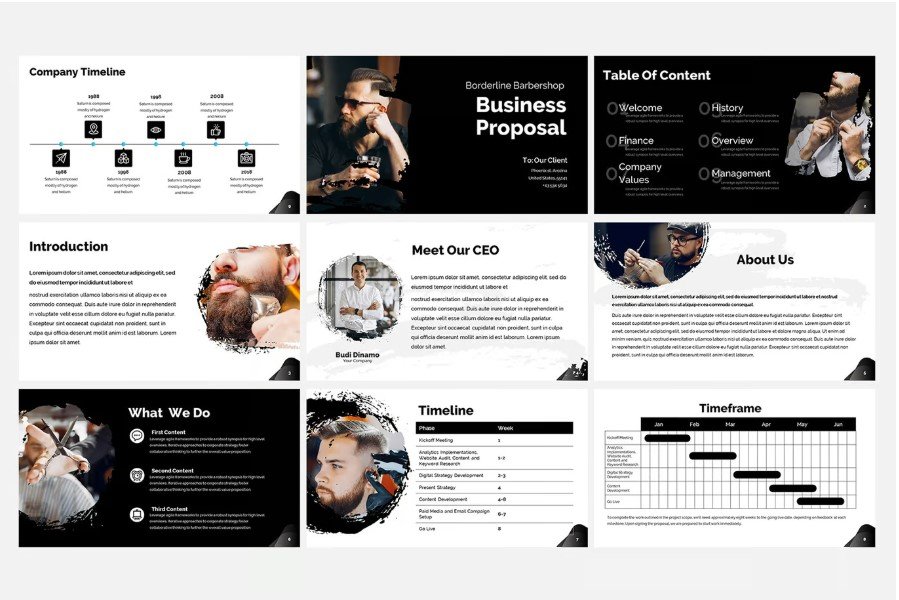 Barbershop Business Proposal | Grooming Salon Pitch Deck | Black & White PPT Template | Salon Investment Presentation | Haircut Business Plan | Modern Barbershop Strategy | PowerPoint for Barbers | Salon Marketing Plan Slides | Gantt Chart Business Template | Investor Deck for Grooming Business | Google Slides Barbershop Presentation | Business Plan for Men’s Grooming | Professional Barbershop PowerPoint | Hair Styling Business Growth Plan