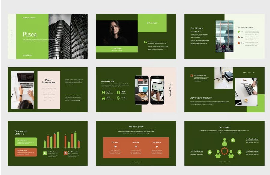 Elevate your business proposals and corporate presentations with the Pizea PowerPoint (PPT) & Google Slides template. Designed with a modern green aesthetic, this template is perfect for project proposals, marketing strategies, and financial reports.