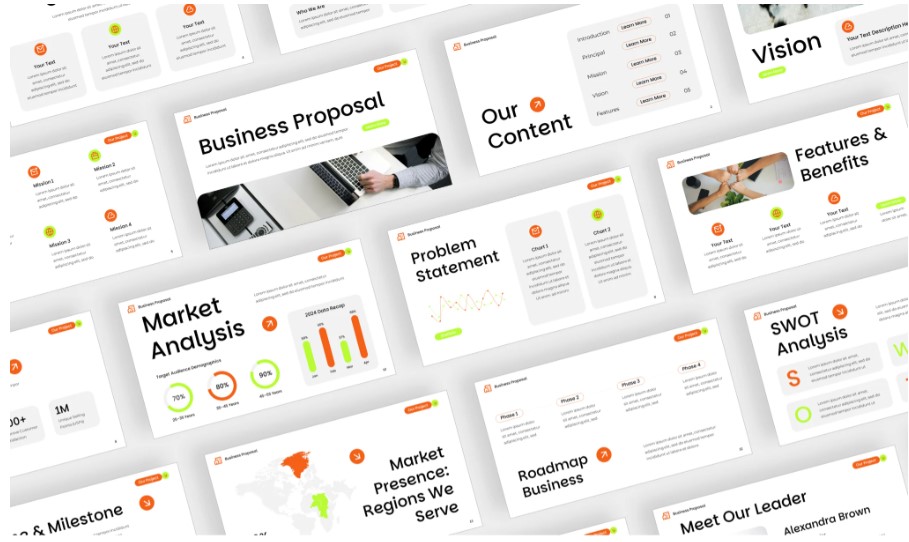 ✅ Business Proposal Essentials – Includes market analysis, SWOT analysis, roadmap, problem statement, and vision.