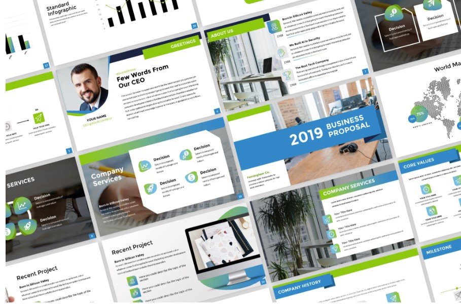 The Modern Business Proposal PowerPoint Template is a professional and sleek presentation designed for entrepreneurs, startups, corporate businesses, and marketing teams. With a blue and green color theme, this template provides a structured, engaging, and polished look for investor pitches, company overviews, and strategic business plans.