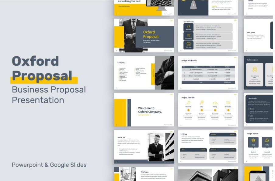 The Oxford Proposal Business PowerPoint Template is a clean, elegant, and professional presentation template designed to help you craft a compelling business proposal. Whether you’re pitching a new project, attracting investors, or presenting to clients, this PowerPoint and Google Slides compatible template will help you make a strong impression.
